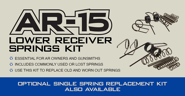 The Strike Industries AR-15 lower Receiver spring replacement kit includes 9 important springs that are commonly replaced or easily lost when building stripped AR-15 lower receivers. The 9-Piece kit includes springs for the bolt catch, disconnector, buffer retainer, trigger, hammer, magazine catch, selector, and two detents.
