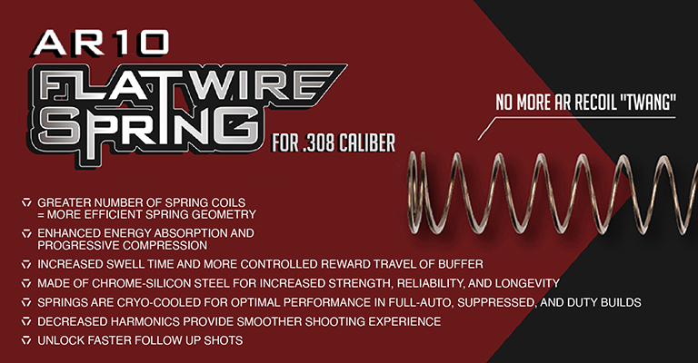 The SI Flatwire Spring is an economical, and easy upgrade to any .308 AR system. The flatwire spring increases service life of the platform, smooths out the shooting cycle, and greatly outlasts the stock spring. Increased bolt load, in addition to decreased compressing force increases reliability in cycling. Additionally, all SI Flatwire springs are cryogenically cycled to provide greater consistency, longer spring life, and greater resilience to high cyclic rates. At a cost not much greater than stock carbine springs, the SI Flatwire is an easy option for those either looking to replace worn buffer springs or begin new builds.