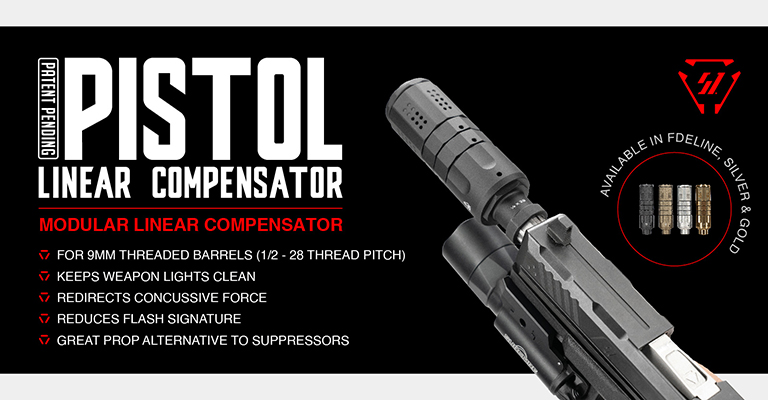 Introducing the Strike Pistol Linear Compensator. Designed for any 9mm handgun's threaded barrel (1/2x28) this Linear Compensator is a multi-piece system that redirects the concussive force and muzzle flash forward. It also helps keep your weapon light clean and free of any carbon which often cakes onto flashlight lenses - it's even tunable in length! At only 1.87 oz in weight, our comp is not only lightweight it's also the first of its kind to provide a solution within such a compact package. In total there are six parts to this product. A base hub for direct thread, three short body pieces, one long body piece, an end cap, o-rings (to place between each section for anti-rotation), and a locking nut. With its modularity, you decide how long or short you want your blast shield to be. The Strike Pistol Linear Comp does exactly what it's designed to do. However, depending on the pistol platform the recoil guide rod spring may need to be tuned. This is due to the increased weight at the end of the barrel, which may cause a shift in the lock-up timing. Therefore, some trial and error may be needed. During our testing, a G17/19 functioned well with an OEM recoil spring assembly when running the full length configuration of our Pistol Linear Comp. In order to run the full length while using all provided bodies, the guide rod may have to tuned with a different spring weight. Other pistol brands and their platforms' performance may also vary. We offer the PLC in anodized black, matte silver, and gold. Keep your weapon lights clean, concussive forces down range, and look cool while you're doing it with the new Strike Pistol Linear Compensator. |