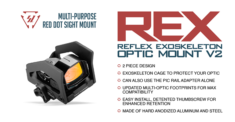 This is the new Strike Reflex Exoskeleton Mount V2. The REX V2 is the latest and second interation of our popular modular mount solution for red dot sights. It's a 2-piece system that offers users the choice to use either just the picatinny mount to directly mount their optics to their needed optic footprints, or, users can utilize the Exoskeleton which is essentially a cage designed to protect your optic from severe impacts. (Similar to the concept of crash bars for motorcycles.) This optic mount is perfect for weapon systems that have top picatinny rails like on a PCC or SMG type platform. Additionally, red dot sights can be mounted on pic rails while being raised in height when the REX-V2 is combined with the REX-Riser. Our main update for the REX V2 is the latest Multi-Optic Footprint which is compatible with several footprints amounting in over 40 red dot sights that could be used with the REX V2. Please see the full compatibility list for optics below. Torque Spec: Do not exceed 15 in/lbs for the picatinny mounting screw. |