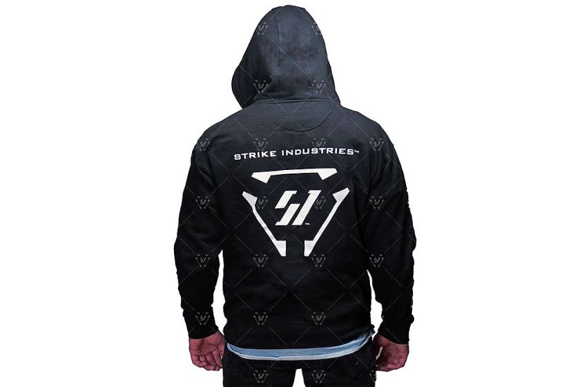 The Strike Industries Strike Hard, Strike Fast! Zip Up Hoodie. It utilizes a full-length zipper for easy on & off. The hoodie features our 2018 brand logo on each arm. The large drawstring hoodie makes this sweatshirt perfect for cold, brisk nights or those early morning range sessions.