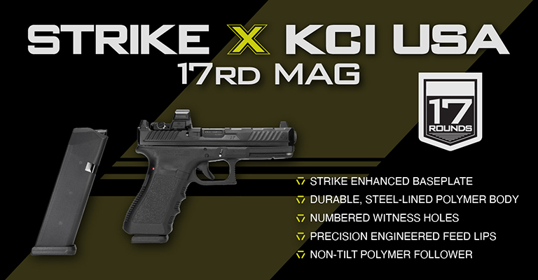 This is a collaboration between KCI USA and Strike Industries. Introducing the new Strike X KCI Magazine for Glock® 17. A favorite among budget-minded tactical and personal defense shooters across the country, the KCI® Magazines for Glock® are an affordable aftermarket solution featuring a durable, high-impact polymer body with a hardened steel lining for lasting performance and factory-like field performance you can depend on. Now with the Strike Magazine Baseplate some new features come to the KCI magazine starting with the baseplate button which includes drainage vents for debris and fluid to exit from. Its ergonomic edges make for a positive grip and easy handling when on the move. ID markers are also available on the bottom of the baseplate to make it easy to label your magazines. With numbered witness holes offer quick, at-a-glance round counts for improved reliability while on the move. Plus, the strong steel spring and anti-tilt polymer follower work together to deliver consistent cartridge alignment and jam-free feeding in any environment. This magazine comes equipped with precision-molded, steel-reinforced feed lips for a snug, wobble-free fit and improved functionality in high-stress environments. Additionally, this magazine is backed by a lifetime warranty, promising years of consistent service and superior quality you can truly depend on. |