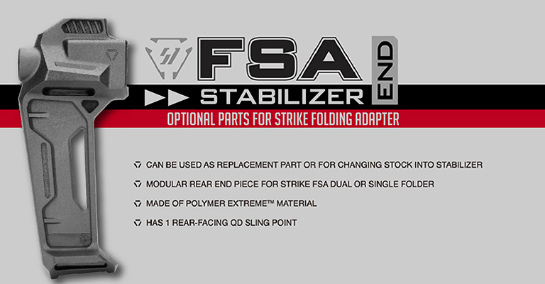 -Stabilizer was designed and intended for use as a stabilizing accessory for one-handed firing along with rear QD sling attachment point for one-handed sling tension firing for stability while using the Strike FSA Dual or Single Folder.